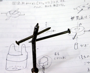 自作ジンバルのパーツテスト。3.5㎜径の古釘に、試しに2㎜の穴を開けてみる。上はうまく入る。下は2.3㎜ほどの釘で挿入後太い釘が破損した。強度は不十分なので、ナットなどに収める。
