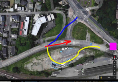 常磐線北交差点の工事。完成予想図から想像すると、赤い矢印のつなぎ先がよくわからない。