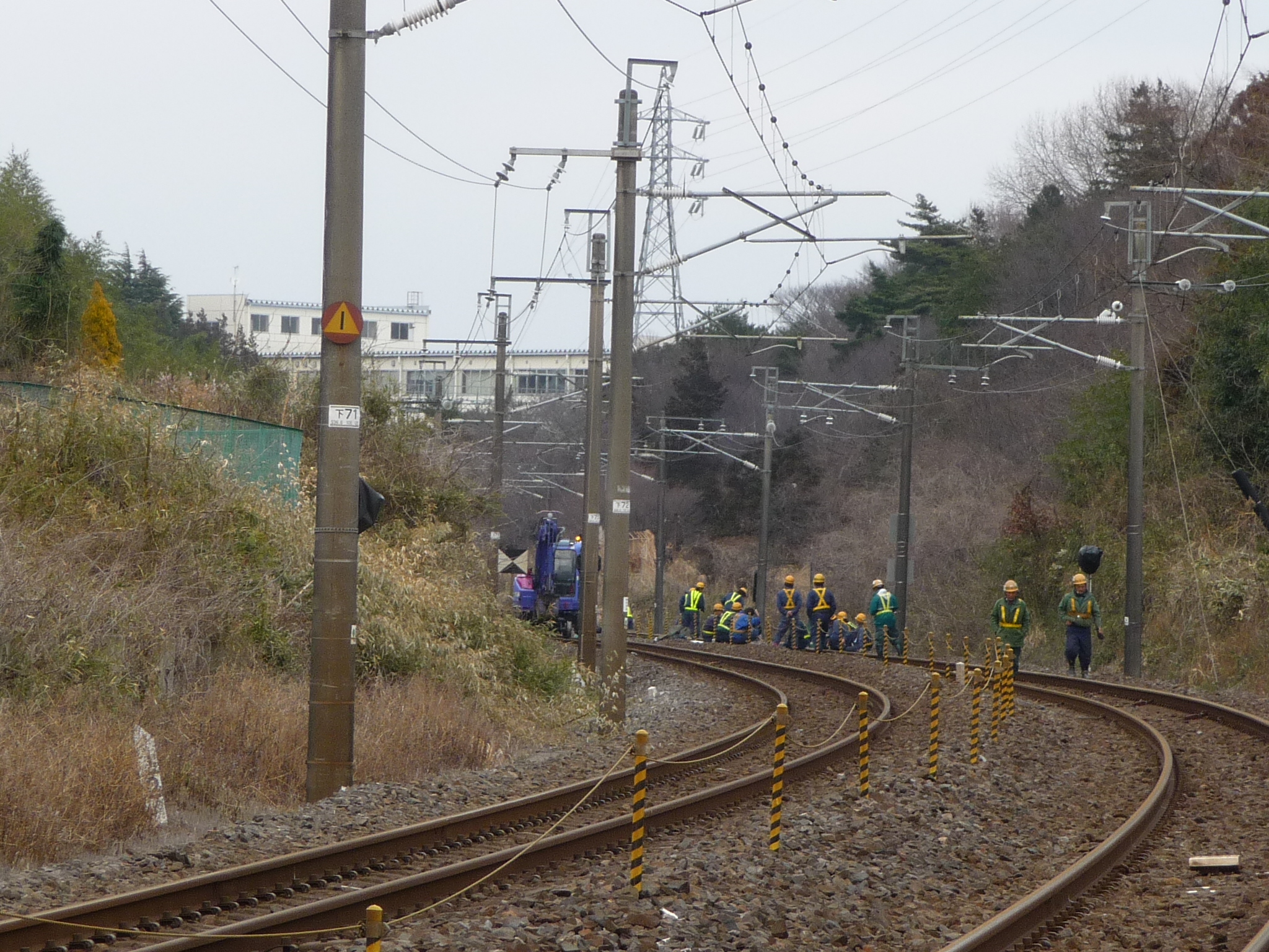 武田から勝田方面 切り通しの谷かと思いましたが、ここは斜面だった模様。 いまは整地されてわかりませんが、左の斜面上から右の池がある低い方に 水の流れる道があったようです。 右側の路肩を補修しているように見えます。 こざ四