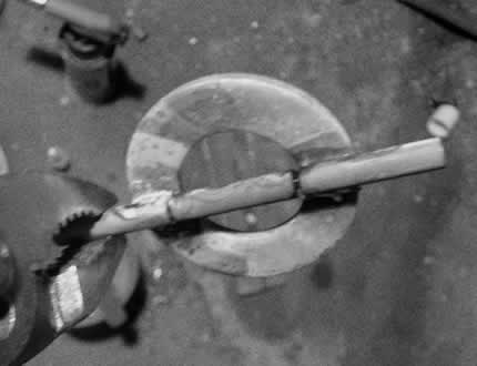 ロウづけしたワッシャの上にホルダ付きベアリングを載せようと画策しました。センター出しで失敗しないように軸のまま取り付けてくっついたあとに切り離せば直線が簡単にできるぜ!ってはじめた工作でしたが・・・・