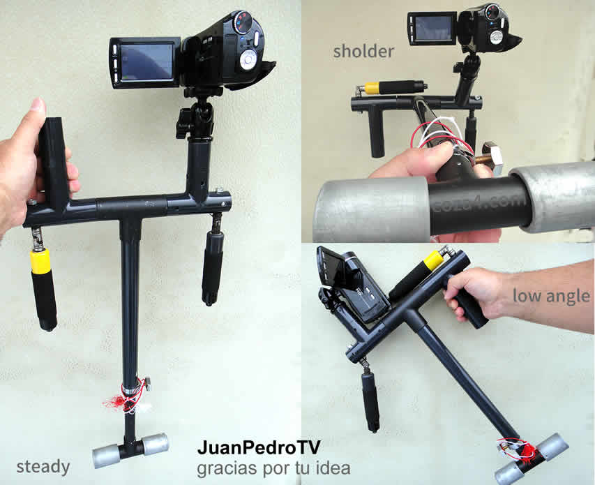 家にあった材料だけで完成。ユニバーサルジョイントの付いたグリップを使うと簡易スタビライザーになります。カメラが片寄っているので当然重心から外れた位置を両手で掴んでますから揺れそうに感じますが、効果は思ったよりあります。