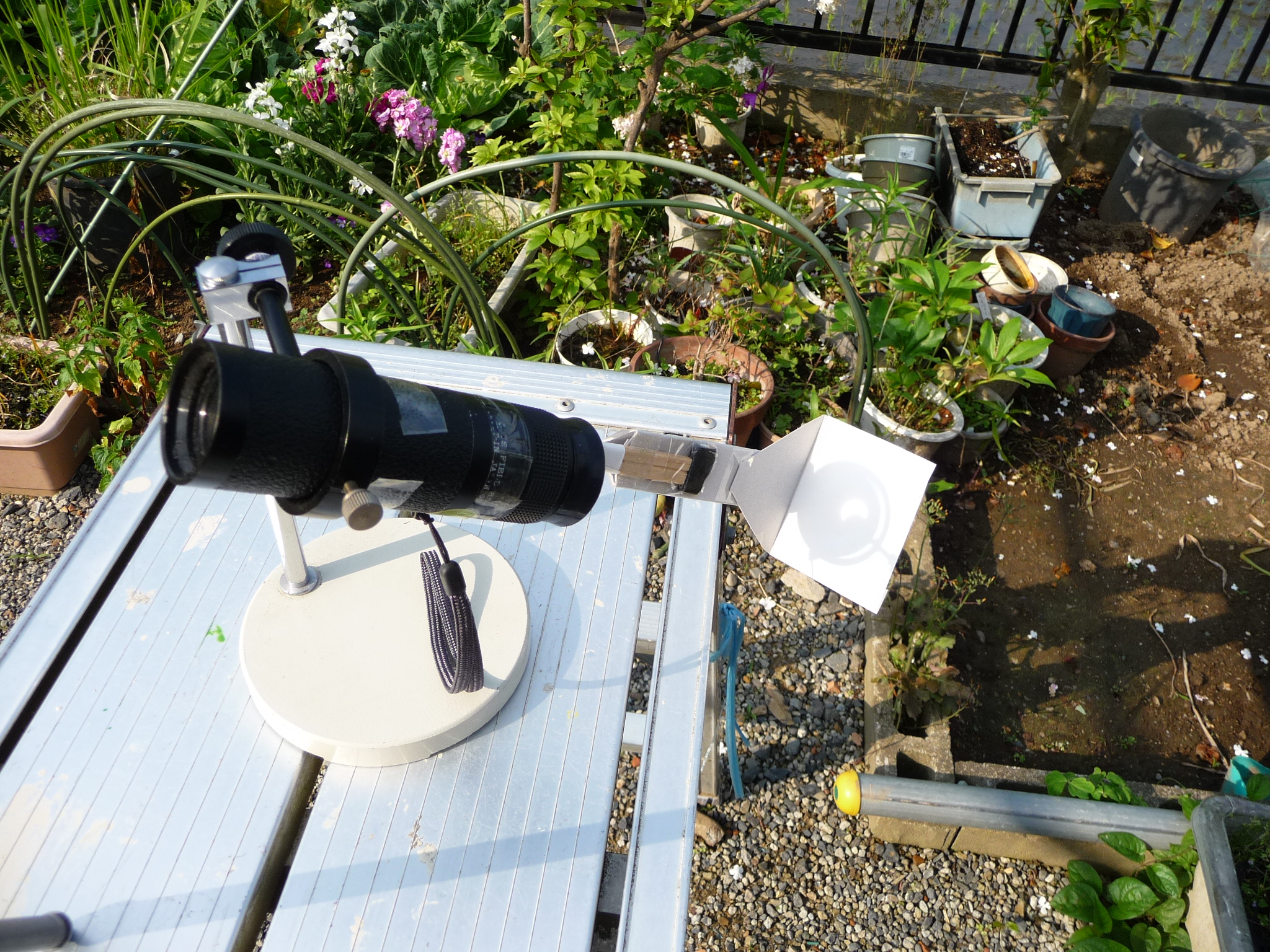 2012-05-23 金環食 日食みました。専用グラスは人に頼まれて買いましたけど、最初から「投影法」で撮影するつもり。前の晩に、ティッシュの空き箱で支柱と投影板を作りました。当日棒が足りなくて、コンビニ弁当で使わなかった割り箸を使い板の支えを延長。厚紙の裏もなんだかなと思い、電話の横にあったメモ帳を貼り付けて完成。 単眼鏡は理科の実験器具で支えてます。 天体観察観測入門:太陽投影板を使った太陽観測 こざ四