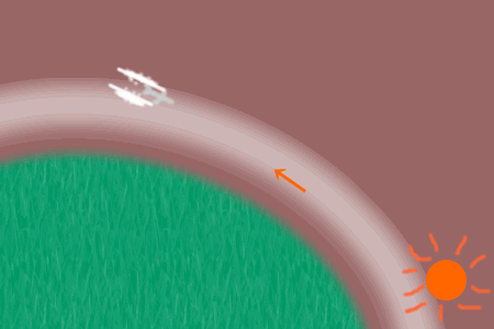 図にするとこんなかんじ。観察者のいる場所は夜だが上空では、夕陽が差します。